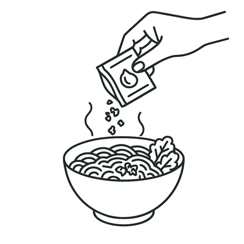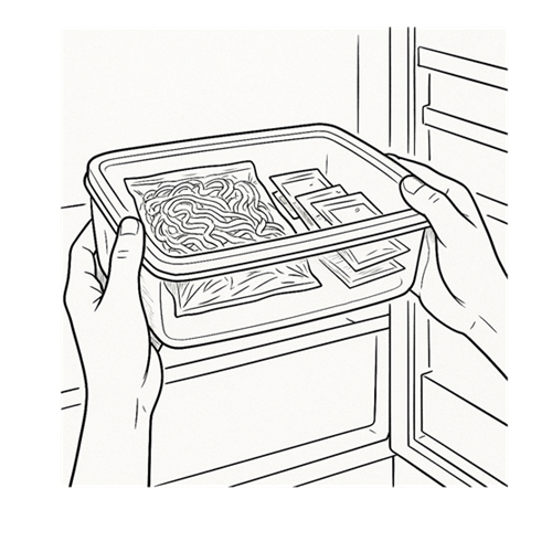 masukan kembali mie dan bumbu yang belum dimasak kedalam kulkas/pendingin. Paket mie ini dapat bertahan selama 3 minggu sedangkan di cooler selama 1 minggu.